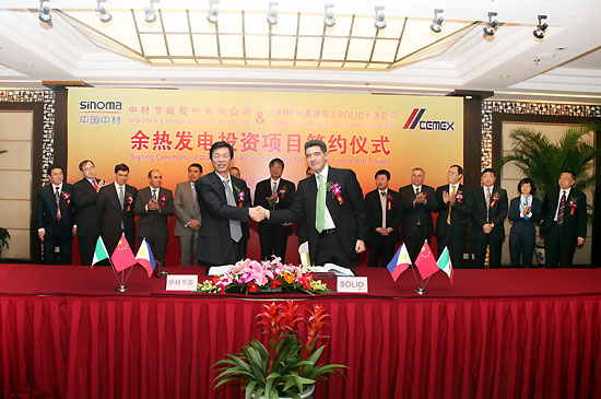 2009年10月,中材節(jié)能開始與CEMEX集團(tuán)亞洲公司洽談該投資項目。2010年4月,中材節(jié)能與SOLID水泥公司簽訂了余熱發(fā)電項目合作備忘錄。經(jīng)多次談判,最終簽署該協(xié)議。此合作模式也獲得了墨西哥CEMEX集團(tuán)總部的肯定。2011年9月,中材節(jié)能與CEMEX集團(tuán)簽署了將本合作模式推廣到CEMEX集團(tuán)其他水泥廠的意向書。今后,中材節(jié)能與CEMEX集團(tuán)將在一批余熱發(fā)電項目上繼續(xù)合作。