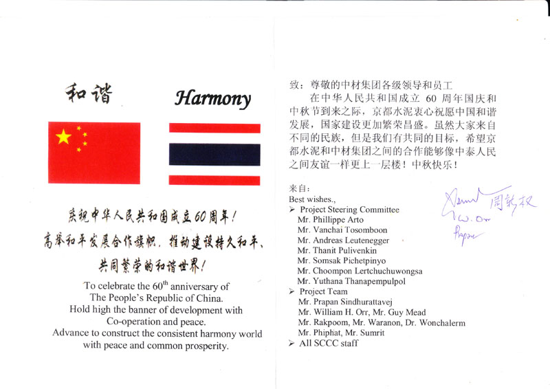 10月1日,適逢中華人民共和國成立60周年和中秋佳節(jié)即將到來之時,京都水泥廠的Choompon Lertchuchuwongsa先生和Prapan Sindhurattavej先生代表京都水泥廠的領(lǐng)導(dǎo)團(tuán)隊(duì)和全體員工前往中材節(jié)能京都項(xiàng)目部,共同慶祝中華人民共和國成立60周年,向項(xiàng)目部全體人員致以節(jié)日的祝賀,送上了月餅、水果等節(jié)日禮品,并轉(zhuǎn)達(dá)了京都水泥對中材集團(tuán)和中材節(jié)能全體領(lǐng)導(dǎo)和員工的誠摯祝福。