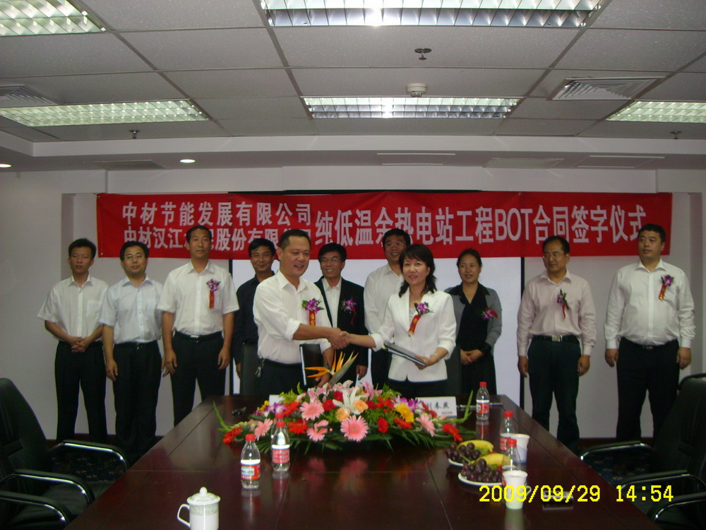 2009年9月29日,在喜迎建國60周年華誕之際,中材節(jié)能發(fā)展有限公司與中材漢江水泥股份有限公司在北京舉行中材漢江水泥熟料生產線純低溫余熱電站工程BOT合同簽字儀式。中材節(jié)能副總經(jīng)理劉春燕和中材水泥副總經(jīng)理兼中材漢江董事長滿高鵬分別代表雙方簽署合同,中材節(jié)能黨委書記劉習德、總會計師水偉,中材水泥副總經(jīng)理路同增、中材漢江總經(jīng)理王樹生、中材水泥投發(fā)部長崔錦等出席簽字儀式。兩公司緊密合作,共同向祖國母親獻上了一份節(jié)能減排的厚禮。