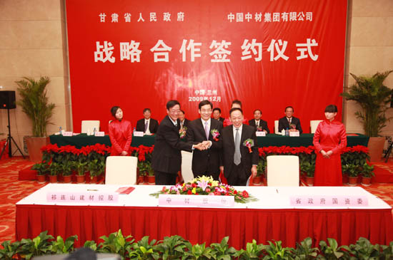 周育先(中)、馬艾武(右)、楊皓代表中材集團(tuán)、甘肅省國(guó)資委、祁連山建材