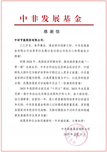 Recently, Sinoma-EC has received a letter of thanks from China-Africa Development Fund, which expresses its gratitude to Sinoma-EC and its investment companies for their important contribution in promoting the high-quality development of new energy power, building materials and other industries in Africa.